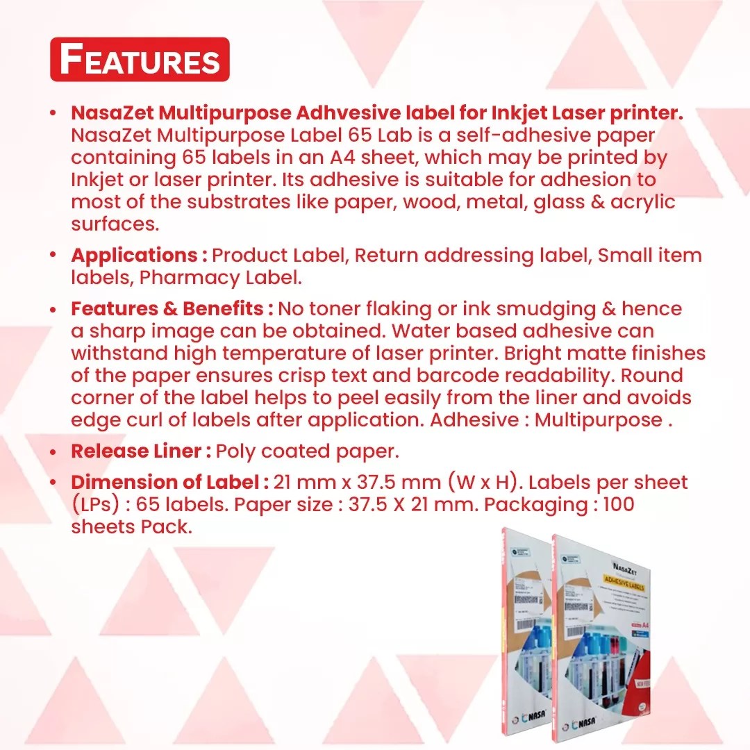 The NasaZet Multipurpose A4 Adhesive Label (65 Stickers per Sheet) is a high-quality self-adhesive labeling solution designed for various applications like product labeling, return addressing, pharmacy labeling, and small item labeling.